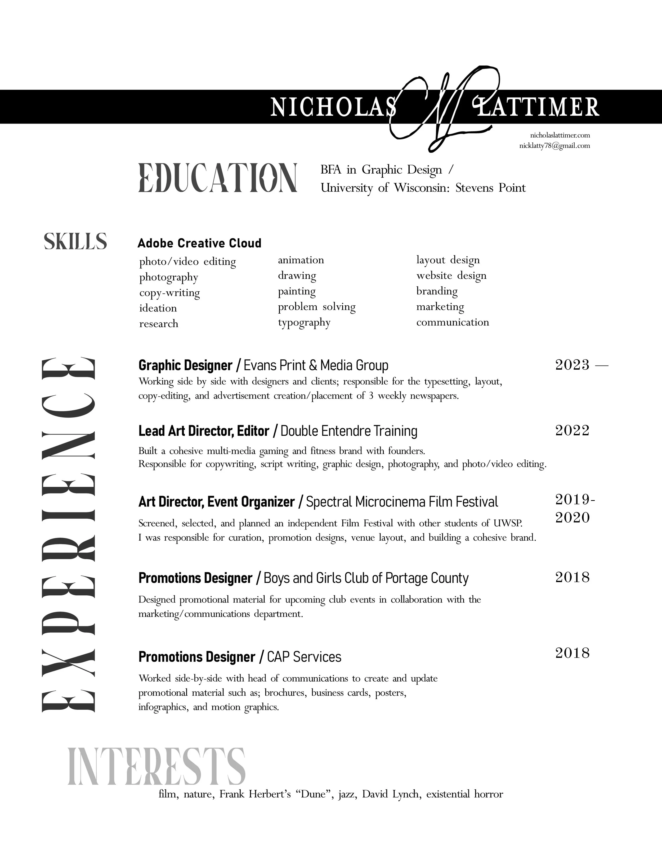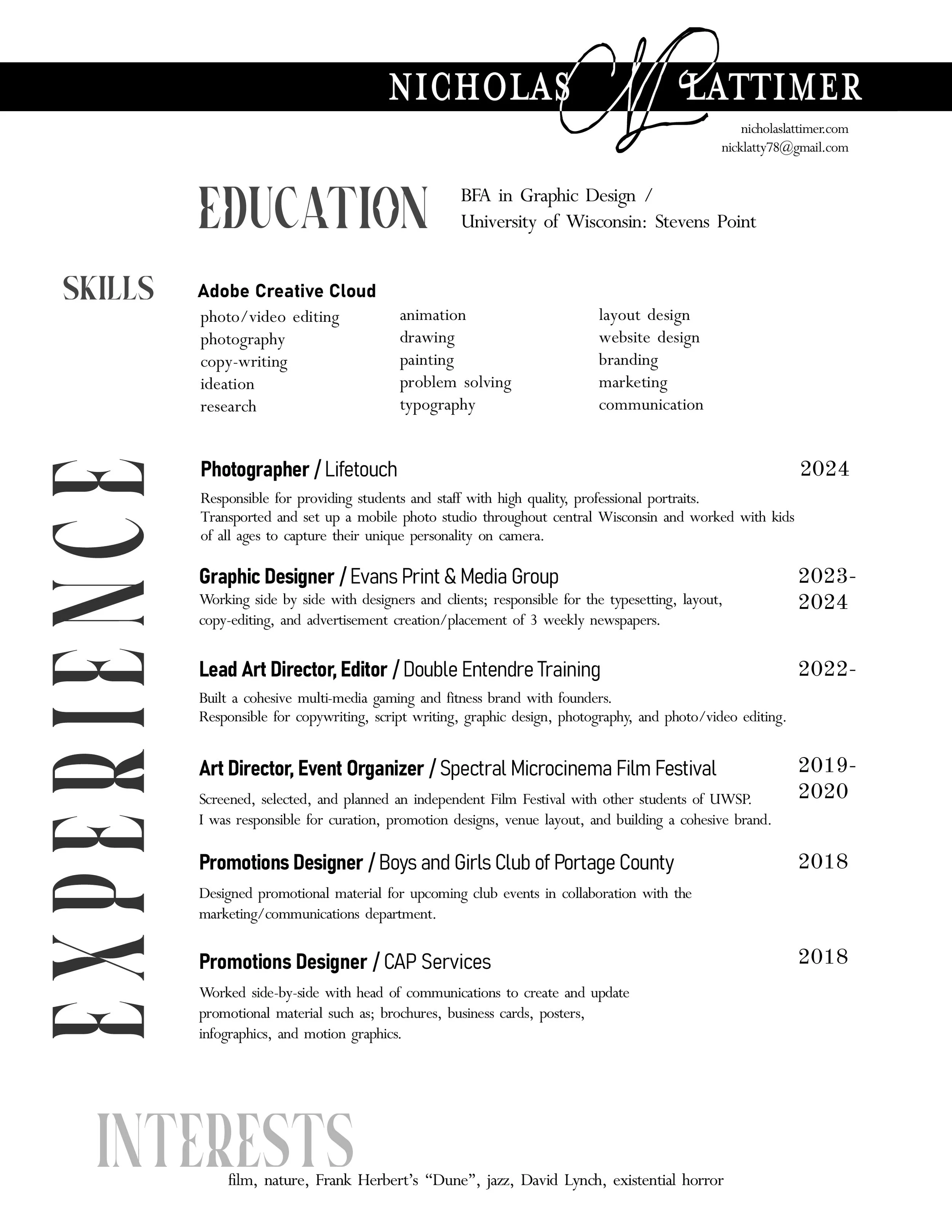 Nicholas Lattimer is a photographer and designer obsessed with the absurd and macabre. Loving to work on grand and abstract concepts that eat away at his psyche as he stares unfocused into the darkness of his crumbling ceiling late at night, Nick believes that art is one of few languages which allows humans to even begin to articulate the horribly lonely experience of life. Perhaps his interest in time-based media and introspective work stems from the fifth grade and the sickening feeling he got in his stomach as he realized that time is an incomprehensible concept that will continue endlessly, meaning his brief stay in the material world will amount to less than a grain of sand in a desert incalculably large, and if an afterlife did exist then how can one enjoy eternity free of any obstacle or personal growth without eventually losing their mind due to the monotony of a utopia which caters to ones every want and need, as pain and suffering is the baseline of humanity?! Or…. maybe he just really likes movies.